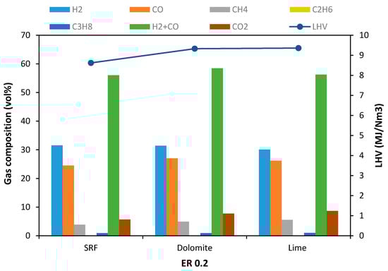 Comparison of gas composition and LHV after using minerals as bed materials at ER 0.2.