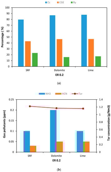 Figure 6a depicts CGE, Cc, and Ry after using minerals as bed materials at ER 0.2. Both dolomite and lime showed a positive effect on CGE, increasing by more than 4% in both cases. The CGE of dolomite and lime showed almost similar performance i.e., 46.48% and 46.67% respectively. In the case of Cc, for both cases, the conversion rate increased by at least 7%. The highest Cc rate was obtained after using lime (87.82%). It happened because of the high yield of CO2 gas after using lime. The use of minerals also successfully decreased Ry, which means more reactions took place after using minerals. After using dolomite, Ry decreased by 7%, whereas after using lime Ry decreased by 5.67%. So, it can be said that dolomite showed a comparatively better result than lime.