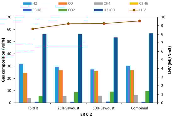 Comparison of gas composition and LHV after co-gasification at ER 0.2. Note that combined denotes the optimum condition of TSRFR gasification; which is 950 °C, ER 0.2, feedstock—75 wt% TSRFR and 25 wt% sawdust blend, bed material—dolomite.