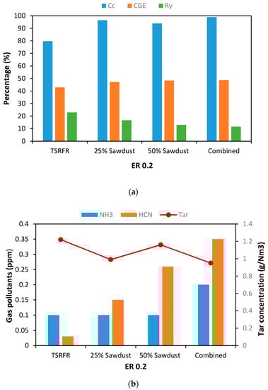 Figure 8a shows the CGE, Cc, and Ry after co-gasification at ER 0.2. After using biomass blends, the 25 wt% sawdust blends showed a 4.26% increase in CGE, and 50 wt% sawdust blends showed a 5.41% increase in CGE. Cc rate also increased after using biomass blends. For 25 wt% sawdust blend Cc increased by 16.78%, and for 50 wt% sawdust blending, Cc increased by 14.23%. The highest Cc (96.47%) was obtained after using 25 wt% sawdust blends. As predicted earlier, uses of biomass blends decreased the amount of Ry. As 50 wt% sawdust blend contains a higher amount of biomass compared to 25 wt% sawdust blends; therefore, the lowest Ry (13%) was obtained for the 50 wt% sawdust blends.