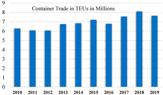 POLB is one of the busiest and thriving seaports in the world is the second busiest container port in the US, after the Port of Los Angeles (POLA), which adjoins it. With an extension of about 13 km2, it generates approximately $100 billion and provides more than 300,000 jobs. In the last few years, as shown in Figure 2, the container trades are reaching the highest level ever, and a contraction has been recorded in a ten-year period [4].