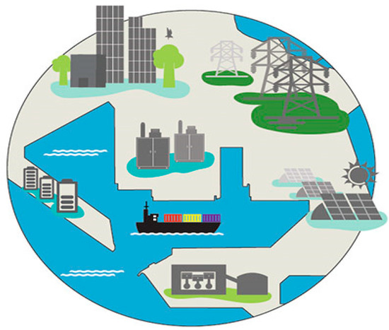Nowadays, by expanding renewable energy sources in electrical power systems, ports authorities have encouraged the use of these units. New solutions for electrical grids are under study in the global community. The main research areas are assigned to renewables, sustainability, low or zero-emissions, smart grids, aggregation, etc. The goal is to create models for smart grids operating in seaports to optimize energy consumption and to reduce the emissions. Not only energy management but also safety and maintenance are the drivers to find new solutions [5,6]. Considering a CT port as a microgrid, such as Figure 3, requires two main infrastructures. The first is the physical assets such as power lines, breakers, transformers, conventional and renewable energy sources, and the second one is communication and control, which is necessary for communication and the controls between the physical assets, for example the local ethernet network, serial connection, microgrid controller, protective relay [7].