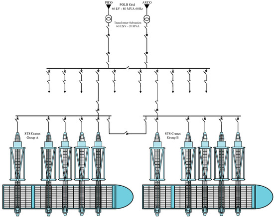 Figure 4 shows the one-line diagram for STS cranes power supply at Pier E. Presently, 10 STS cranes do the container moving for two ships at the same time. The development (in the near future) of Pier E is planned for 14 cranes to increase productivity. The minimum number of STS cranes in a group is five, and the total is 10 STS cranes. By this system, a list of different goals as below are achieved: