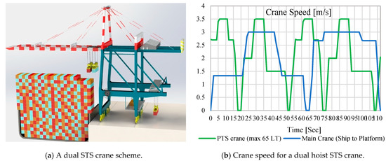 An STS crane is able to unload two 40 ft. containers at once, with a cycle that is completed by two independent cranes mounted on the same frame, while sharing a common platform. To differentiate the two cranes, two different acronyms will be used, the first one is ship to the platform (STP, more than one container for lifting) for the main dual hoist crane and the second one for the platform to shore (PTS, only a sigle container for lifting) crane. Since the PTS crane is equipped with a single hoist lifting capability, it has designed to operate two times faster than the PTS sub-crane. Table 1 shows the dimensions, both in feet and meters, of the considered crane, as well as the expected times in which the crane is expected to execute the task of the cycle.
