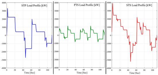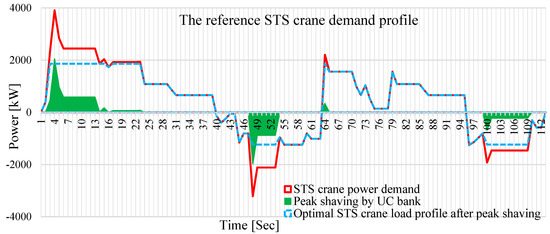 As can be observed in Figure 12, by the optimal UC bank sizing (from a technical and economic point of view), the power demand significantly dropped, as shown in blue. In Figure 12, the red curve is related to the conventional STS crane, the green one is the UC bank charging and discharging operation, and finally, the blue curve is the optimized load profile for the STS crane, and it has been considered as a new load profile for the next step, which will be crane’s duty cycle management.