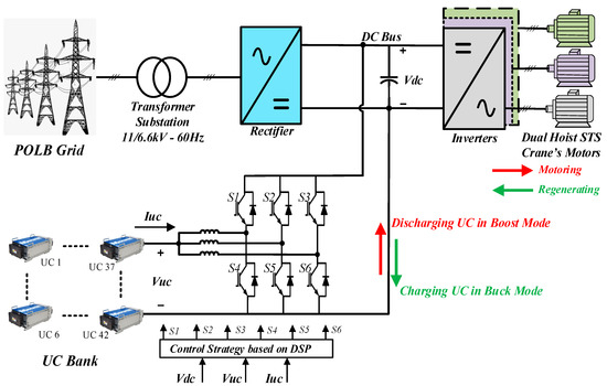 Figure 8 shows the overall scheme of the dual hoist STS crane which is connected to the POLB grid through the AC/DC/AC converters to avoid the voltage rise, leading power factor, and harmonic distortions [33]. The UC bank is connected to the DC link via the bidirectional DC/DC converter. The bidirectional DC/DC converter operates on the boost mode in which electric power is supplied from the UC stage (UC bank discharging in hoisting mode) to the dc link, and on buck mode in which electric power is absorbed from the dc link to the UC (UC bank charging in lowering mode). Bidirectional DC/DC converter applications can handle a high amount of load currents up to several hundred amperes. The control strategy of the DC/DC converter is based on a TMS320vc33 digital signal processor (DSP) which is able to do the speed and electromagnetic torque estimation [34].