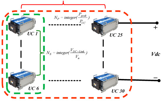 Due to each branch equal capacitance, 10.5 F, the number of parallel branches and the total number of required UCs are calculated by Equation (11) and the UC bank arrangements in terms of required energy is shown in Figure 10.
