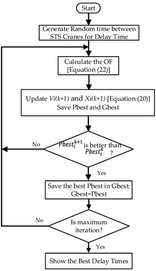 - Fitness of each Pbest particle is measured, and the particle that has the best Gbest fit is stored. Pbestik is the best position of the ith particle, which is based on the experience of the particle. Gbest is the best position of the particle, based on the group’s overall experience. Figure 13 shows the delay time management of the PSO flowchart for the STS crane group.