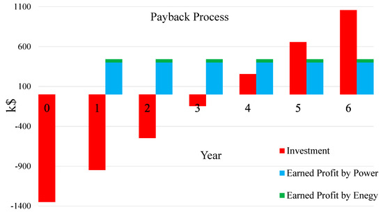 According to Table 5, the amount of peak shaving which is accomplished by five STS cranes and by using both the UC and DSM scenarios is about 6078 kW, while this amount is almost 4420 kW for using the DSM strategy alone. According to the fact that DSM scenario cost is negligible is and the earned profit must be calculated by a comparison between DSM only and UC along with DSM scenarios. Based on the tariff of imposed cost by peak power, which is 22 $/kW, the amount of earned profit is about 37 k$ for a single month by using both the UC and DSM strategies. Due to a one-month maintenance period, the total crane operating duration is considered as 11 months, and the annual earned profit is almost 401 k$ and the initial investment will be paid back after three years and half. As shown in Figure 15, Pier E will start to profit from the fourth year.