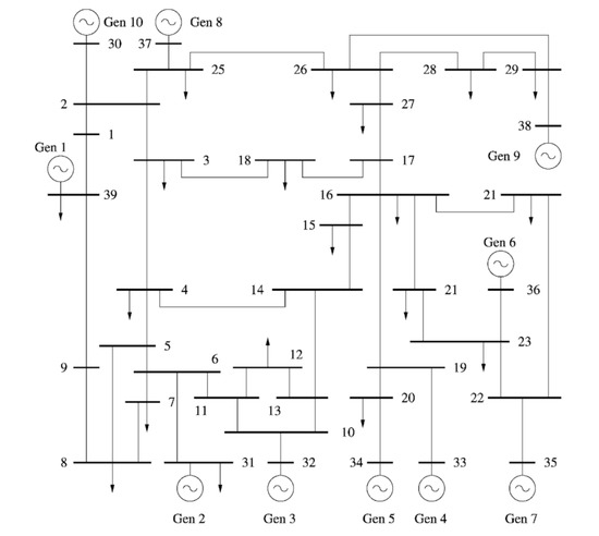 Figure 4. 10 machine-39 bus system. - System IV: 16-machine, 68-bus system.In Figure 5 a unilinear diagram of the 16-machine, 68-bus system, is presented.