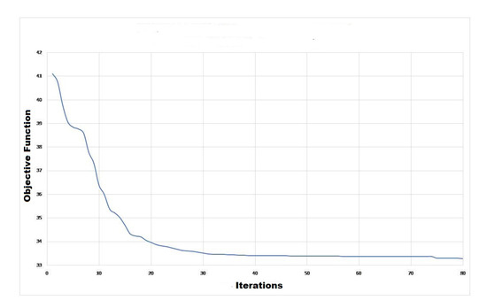 With the fitting of the stabilizers presented in Table 8, the system reaches a minimum damping of 3%, which is not enough according to the tuning approach/methodology used. In Figure 9, it is possible to notice the objective function behavior in the 16-machine, 6-bus system during the iterative process.