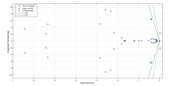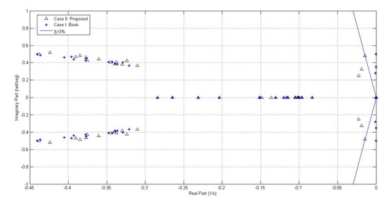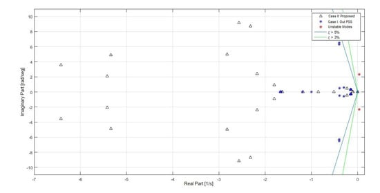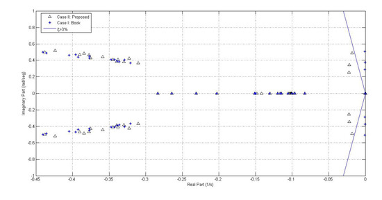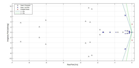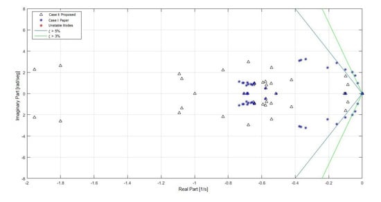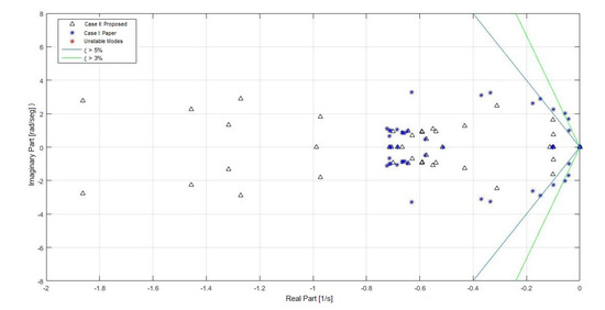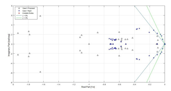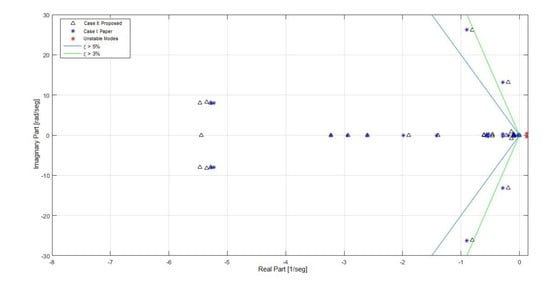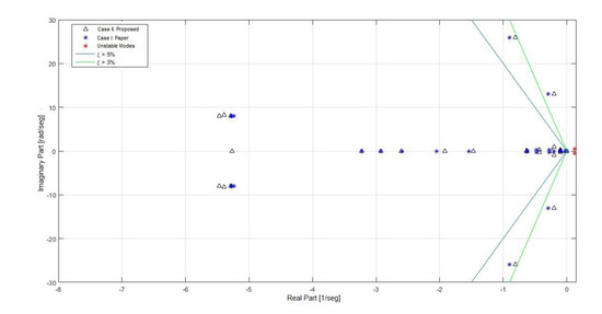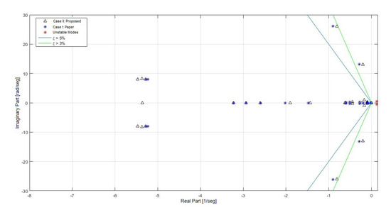Figure 15. Eigenvalues in heavy load operation condition.From the above presented figures, it can be seen that the proposed tuning for case II provides a response in which the system is stable; however, it does not reach the 3% damping of the oscillation modes, similarly to the operational normal condition. However, it is possible to notice that for case I, the system has values with a positive real part for both heavy and light loads. Therefore, the fitting proposed for this study improves the stability of the system for the simple contingency conditions.