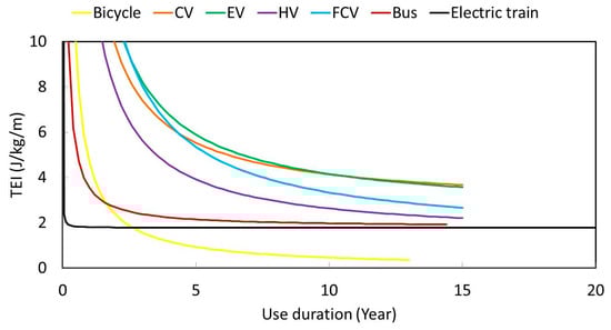 Then, the transport energy intensity in 2015, with the change of use duration, is monitored. The result is presented in Figure 2. The transport energy intensity of all of the transportation means decreases in inverse proportion to use duration. Particularly, for automobiles and bicycles, there remains room to improve the transport energy intensity by increasing in the use duration. If the lifetime is extended for another 5 years, the transport energy intensity of bicycle and automobile potentially increases by 38% and 6%, respectively. For electric trains, due to the negligibly small impact of material consumption on the transport energy intensity, its TEI almost remains the same after the three months of operation. This is because the dominator in Equation (6) is significantly greater than the energy consumption for material structure of electric train. The much heavier weight and longer movement distance of electric train compared with other transportation means would highly affect this difference. Given the longer lifetime of railway rolling stock compared with automobiles and buses, electric train would be an appropriate mean for urban transport.