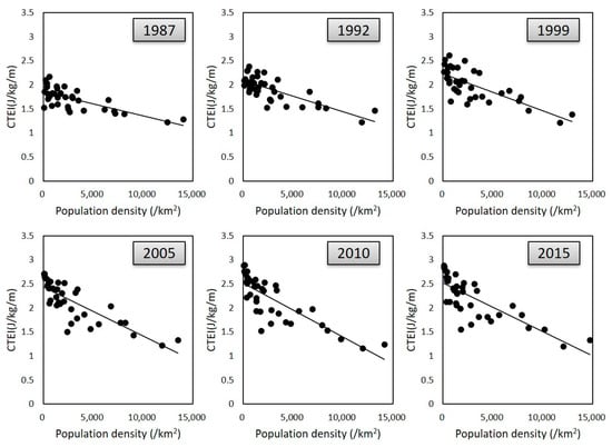 First, the relationship between intracity transport energy intensity and population density in 1987, 1992, 1999, 2005, 2010, and 2015 is illustrated in Figure 3 and its regression model is presented in Table 3. In 1987–2015, the greater level of population density is associated with the lower intracity transport energy intensity in Japanese cities. This negative trend matches the global trend which has been widely reported (e.g., see the most well-known research work relevant to its trend conducted by Newman and Kenworthy []). Given the high score of R2, the high level of negative correlation in the range of 1987–2015 could be seen in Japan’s case. Meanwhile, it is seen that the regression coefficient becomes lower with time, which means the negative slope of regression line increases in the course of year.