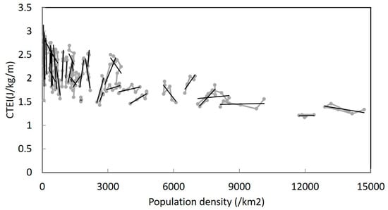 The intracity transport energy intensity in the course of change in population density by city is presented in Figure 4. To show the trend of each city, the regression line is presented as well.