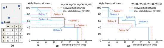 Figure 1c shows two other waveforms for the same delivery task in which the weights change to , that is, in which the heaviest package corresponds to the closest destination (node 1). In this case, the red dotted profile of the “heaviest-first” yields the best value of the metric, while the “min. total distance” yields a slightly worse value. Notice that the blue solid line corresponds to the same order of delivery (yet with a different cost) as in Figure 1b as the distance has not changed in the two examples.