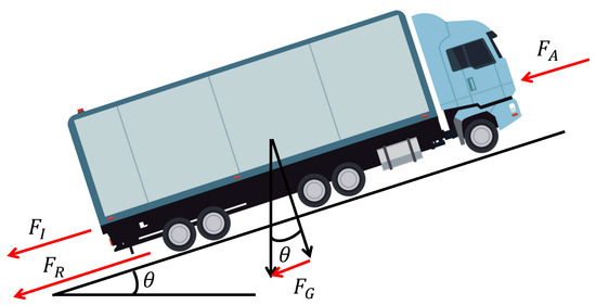 As is common, the vehicle powertrain model is from the vehicle dynamics. There are four forces acting on a vehicle driving on a road with road slope, as shown in Figure 2: rolling resistance , gradient resistance , inertia resistance , and aerodynamic resistance .