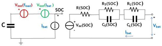The methodology to extract the relationship between SOC and internal resistance, capacitance, and open circuit voltage is presented in [10], and the implementation of adding two different dependencies of load current on the left-hand side of model is introduced in [9].