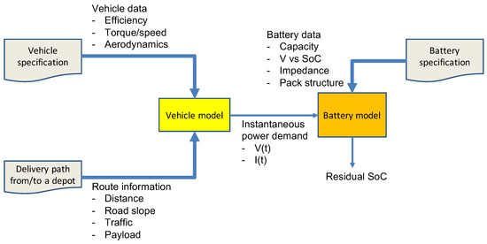 Vehicle data includes (1) motor information: motor efficiency by motor torque and RPM, operation range of motor torque and RPM, (2) vehicle information: weight, drive train and body shape, and (3) other electrical systems. Facial area of the vehicle affects aerodynamic resistance. Route information include road distance between cities, road slope, and traffic on each road. Also payload by a delivery task is given. Route information and vehicle data is used in the vehicle model, which generates instantaneous power demand (V(t) and I(t)) during delivery.