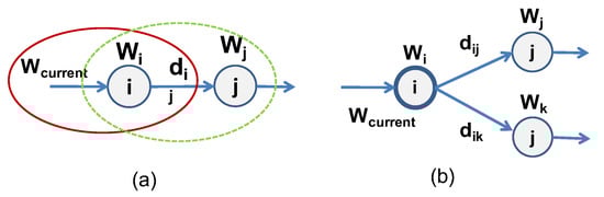 The examples in Figure 1 suggest that a reasonable metric to track the energy spent on a delivery path could be to use a quantity that is correlated to the product of distance × weight. More precisely, let i and j be two vertices of the delivery graph, the distance between them, and and the weights to be delivered, respectively, at i and j. This metric should be proportional to , assuming the edge is traveled in the direction . is the current weight of the vehicle when reaching node i (Figure 5a); this metric, which we call Dx hereafter (i.e., distance times residual weight), uses the information contained in the solid oval circle.