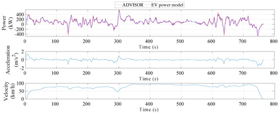We first implemented a vehicle model in ADVISOR (ADvanced VehIcle SimulatOR) [22] by using the above vehicle specification. Then, we extracted the coefficients of EV powertrain model with a number of ADVISOR simulations, as described in [23]. Table 2 summarizes the model coefficients of Tesla Semi. We compared the results computed between the derived power model and ADVISOR to validate the model we used. Figure 6 shows the difference between the estimation of power consumption by the ADVISOR vehicle simulator and the powertrain models we derived; the normalized root-mean-square error is 4.93%.