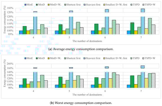 Figure 7a shows the energy consumption of the optimal route, averaged over the 50 instances, for problems with 4–7 destinations and for the set of algorithms described in Table 1.