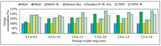In this section, we discuss how the error increases with the increased package weight. Figure 8 shows the energy consumption of different metrics by package weight distribution. Each column means different weight distribution of delivery package: 0.1–0.5, 0.5–1.0, 1.0–1.5, 1.5–2.0, and 2.5–3.0 ton, respectively. In this comparison, one depot and seven destinations were uniformly distributed in a 30 km × 30 km area, and we extracted average energy consumption of 50 instances by different metrics. In order not to provide unnecessary information, we do not consider MinDx and Heaviest first metrics here because these metrics show either sufficiently accurate or irrelevant results from the previous section.