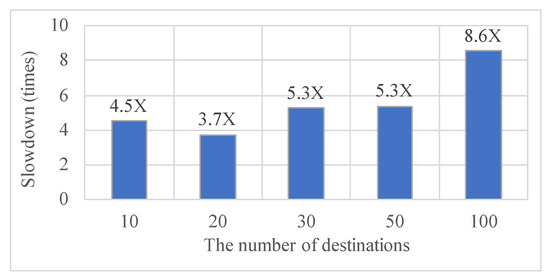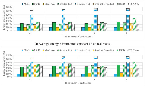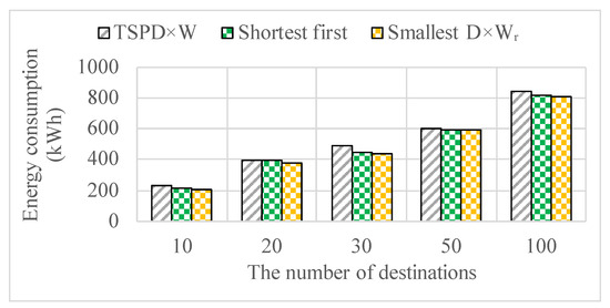 Figure 12a shows the average energy consumption of the optimal route in the case study described in Figure 11 on the 50 instances with routing algorithms described in Table 1. When the number of destinations was four, we randomly picked one depot and four destinations among the 10 cities in Figure 11.