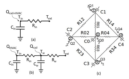 Grey-box models are a combination of both White- and Black-box, combining statistical information with physical, structural and thermal parameters of buildings. A number of studies show that a building’s thermal behavior can be modelled as an RC circuit [,,,]. In this analogy with electric circuits, walls and air mass are represented by resistors and capacitors, temperature by electric voltage, and heat flow by electric current.
