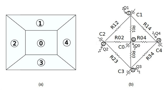 As shown in Figure 2a, the first case-study building taken under consideration consists on a 5-zone thermal network building (hereinafter referred to as 5-zone building). It consists of a simulated building, with an area of 10,000 m2, and it presents the same thermal structure that has been used in []. The 5-zone building is our benchmark to evaluate the difference of using the proposed multi-model algorithm compared to our previous work []. Figure 2b shows thermal connections between the zones. As explained in Section 4, the electric resistance symbol indicates the thermal resistance between two connected zones, instead the electric capacitor symbol indicates the thermal capacitance of each zone. For the sake of simplicity, each connection with the external environment was not graphically represented. Instead, heating system injections have been depicted for each zone (refers to arrow curves in Figure 2b). To be consistent with our previous work [], in this system architecture, this building is completely heated through a HVAC heater in each zone. However to forecast temperature profiles both for heated and unheated zones with this configuration, we need to run two simulation with Energy+: the first considering the heating system turned on, the second with the heating system switched off.