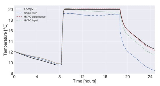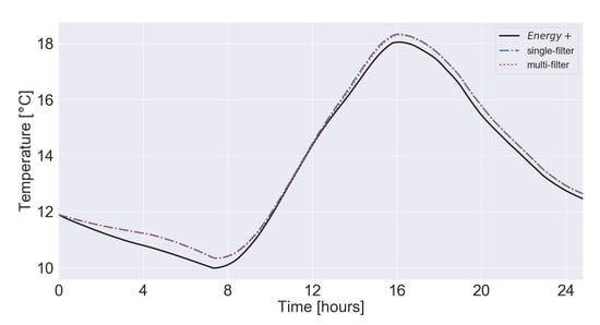 Figure 4 and Figure 5 show the prediction for the future 24 h of indoor air temperature for the 5-zone building. Figure 4 reports the indoor temperature for a zone where the HVAC is turned off. The black continuous line shows the temperature profile simulated with Energy+. The red dotted line shows the predicted air temperature with the multi-filter algorithm, where we have one filter for each zone. The blue dotted/dashed line represents the single-filter algorithm, where we have all the zone temperatures managed by a single filter. The filter, in both configurations, is able to reconstruct the real temperature profile when no heating system is present. In this situation, the shape of the temperature profile is only modified by input terms (external and nearby temperatures) and solar radiation gain. As we can notice, for a non-heated zone, to combine together or to split the zones does not affect the result pretty much. For the 5-zone case-study, the computation time needed by the desktop computer to run the simulation is about 444 s with the single-filter algorithm, and about 183 s with the multi-filter algorithm.