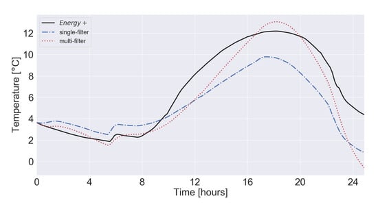 Figure 6 and Figure 7 show the prediction for the future 24 h of indoor air temperature for the 17-zone building. Just as for the previous case, initially we have investigate the behavior of the filter for an unheated zone (Figure 6). In this case, we tested both the single-filter method to construct the filter (the blue dot-dashed line), and the new one that splits the state-space in 17 different UKFs (the red dotted line). Results of single-filter are much worst than those obtained with multi-filter. For the 17-zone case-study, the computation time needed by the machine to run the simulation is about 277 s with the single-filter algorithm, and about 124 s with the multi-filter algorithm.