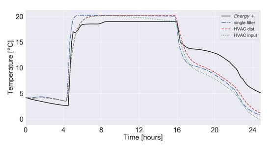 Figure 5 lays out the temperature profile for a heated zone of the 5-zone building. Here the two implementations of the multi-filter algorithm are reported: the red dashed line represents the prediction in which the HVAC system is considered as a disturbance. The green dotted line represents the prediction where the HVAC is considered as an input. As we can notice in both cases, the proposed algorithm generates acceptable results (RMSE < 0.6 °C). However, considering the HVAC system as a disturbance enhances the forecasting precision. Figure 5 shows also the single-filter algorithm temperature prediction with a dot-dashed blue line. By comparing the two version of the algorithm, it is possible to notice that the multi-filter, having a filter for each zone, leads to better results than the single-filter presented in [].