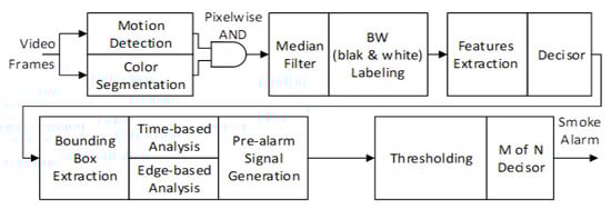 Figure 1 shows the logical flow of the proposed video smoke detection algorithm, which is based on motion detection, segmentation, features extraction, and elaboration of the video frames. The algorithm is designed as a chain of image and video processing tasks. The sequence of elaborations ends with computation of a real-time alarm signal.