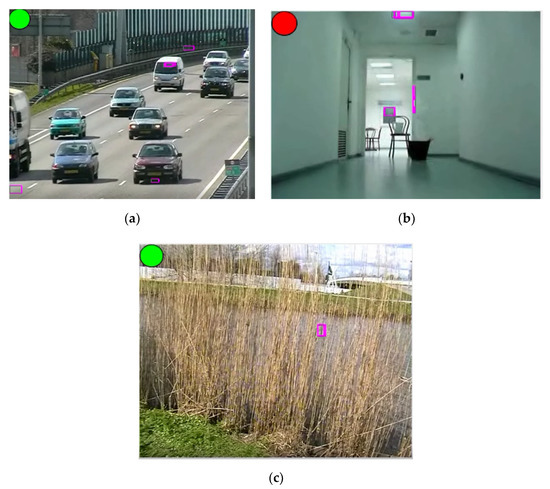 The proposed technique has been tested with a large set of test videos from 320 × 240 to 1920 × 1440 pixels/frame, while the frame rate is between and (including all intermediate formats usually present in the state-of-art systems). Hereafter, we show the pictures of the output processed videos for three outdoor cases (Figure 2i and Figure 3a,c) and one indoor case (Figure 3b) representing both the case of true positive (Figure 2i and Figure 3b) and negative (Figure 3a,c) conditions. Purple boxes in the figures refer to detected blobs. The alarm is only generated when the red circle appears on the top left of the image (Figure 2i and Figure 3b); otherwise the circle displayed is green.