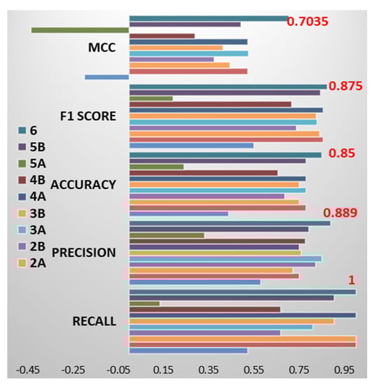 The metrics chosen to evaluate the goodness of the algorithm are recall, precision, accuracy, F1 score, and MCC; see formulas in Equations (7)–(11). The recall means how many relevant items are selected. The precision indicates how many selected items are relevant. The accuracy shows how close you are to the true value. The F1 score is the harmonic mean between precision and recall. The MCC parameter has a range that starts at −1, when there is a complete misalignment between predicted and true value, and ends at +1, when there is a complete alignment between predicted and true value. When the MCC is equal to 0 it means that the prediction is random compared to the true values.