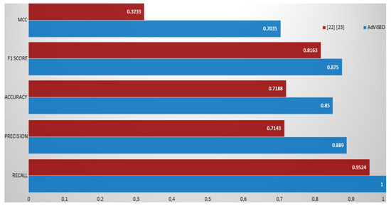 The results in Figure 5 show an improvement in terms of all parameters, MCC, F1 score, accuracy, precision, and recall, of AdViSED compared to the state-of-art techniques [22,23]. This is mainly due to an improved Kalman-based motion estimator in Section 3.1, by the fact that the decisor in Section 3.3 takes into account multiple geometrical parameters (together with the color parameters). The new edge and time-based analysis in Section 3.4 permits also an improvement respect [22,23]. The results in Figure 6 show a relevant improvement of the computational complexity. Indeed, using the same dataset and the same hardware condition, the total amount of time to get the results is less than a third. The improvement is justified by the fact that a more accurate Kalman motion estimation avoids the generation of too many smoke blobs that must be iteratively processed in the next steps.