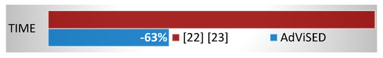 Figure 5 shows a comparison in terms of estimation parameters between the algorithm proposed in [22,23] and AdViSED. Another comparison in terms of computational complexity is provided in Figure 6. The latter is evaluated as normalized execution time when running the algorithms via SW on an Intel Core i3-4170 CPU, with Intel HD Graphics 4400 GPU, 8GB DDR3 RAM, equipped with Windows 10 Pro x64 operating system. Results in Figure 5 and Figure 6 represent the average of the results obtained for the whole test videos.