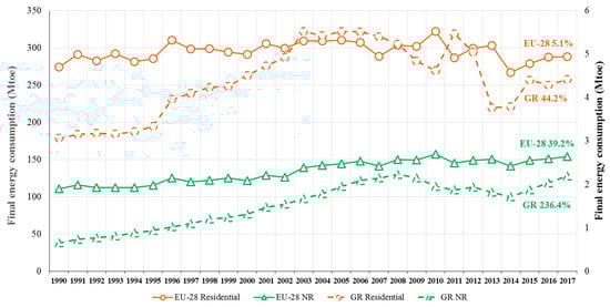 Time evolution of final energy consumption in residential (circles) and nonresidential (NR) (triangles) buildings for EU-28 (solid line, primary axis) and Greece (dashed line, secondary axis). The percentages refer to the corresponding increase of the final consumption in 2017 compared to 1990. (Data source [3]).