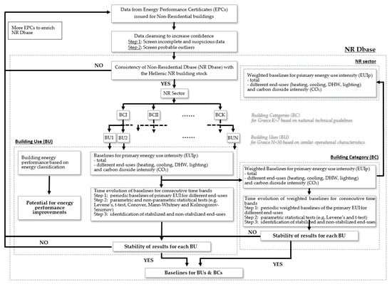 This work exploits for the first time the most comprehensive data included in the national EPC electronic repository (buildingcert) over a nine-year period (i.e., from January 2011 to the end of 2019). The main novelty and objective of the present work is to present a well-structured, modular methodology for the exploitation of data included in EPC databases, in order to fill the gap of knowledge on the performance of the existing NR building stock. The proposed methodology provides a complete approach, starting with the data quality control, the data clustering into building uses and building categories, and the definition of practical baselines on the energy use and CO2 emissions for different clusters. The work demonstrates the application using the national EPC database in Greece and further investigates whether the derived baselines can be regarded as typical for the Hellenic building stock. The paper is structured as follows: Section 2 provides an overview of the national EPC database. Section 3 presents the method used in the analysis for deriving the baselines and for assessing the time evolution of the indicators. Section 4 applies the overall approach to the national EPC database and presents the results of the analysis. Finally, Section 5 discusses the main findings, outlines the limitations of the work and concludes by summarizing the main findings.