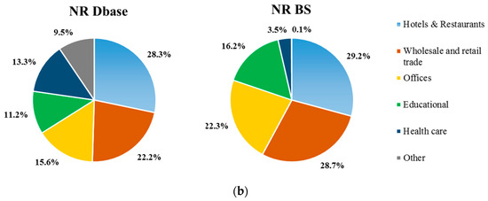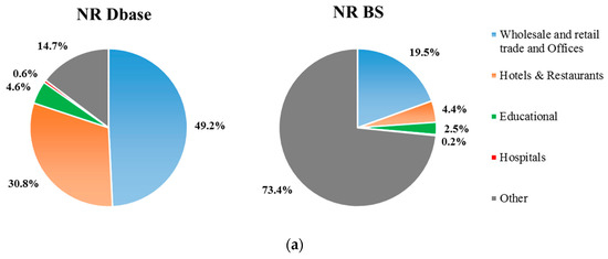 The profiles of the number of buildings and the total floor area for the NR BS and NR Dbase are illustrated in Figure 3. The buildings included in the NR Dbase comprise only 4.1% of the NR BS, but the total floor area the percentage reaches 23.5%. Figure 3b indicates that the breakdown of the data available in the NR Dbase into the various building uses is similar to that of the national building stock.
