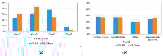In order to justify the use of the resulting average values as baselines for the different BUs, the work assesses whether the NR Dbase could be considered representative of the Hellenic NR BS. The distribution of available data is defined for the number of buildings and size (i.e., heated floor area) and is then compared to the corresponding distribution of the NR BS from official national statistics [3,6]. In addition, the spatial distributions of the audited buildings according to climate zones, as well as to the four major socioeconomic regions (NUTS1 regions) are defined and compared to the corresponding distribution of the NR BS [6]. In case of similarity in profiles, the NR Dbase can be considered representative. Otherwise the results should be used with caution and the definition of baselines should be repeated at a later date when more data become available.