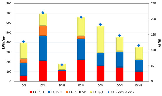 Weighted average primary energy use intensities (EUIp) per end use (columns, primary axis) and CO2 emissions (diamonds, secondary axis) for the seven building categories (BCI-VII).