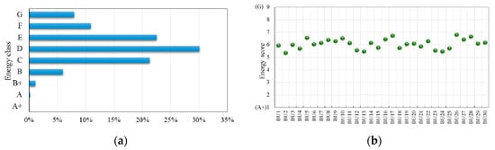 The distribution of NR buildings in energy classes (a) and the weighted energy score of NR buildings (b).