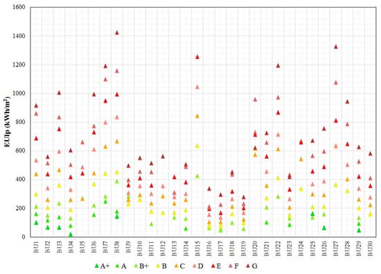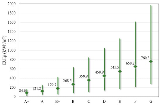 As expected, the average EUIp increases from the highest to the lowest energy class, ranging from 84.6 kWh/m2 (class A+) to 760.3 kWh/m2 (class G), as presented in Figure 7. Considering that 41% of the NR buildings are ranked in energy class E or lower, there is a significant potential for energy performance improvements by renovating the existing building stock. More insight is gained by referring to the distribution of average EUIp per energy class for the different building uses (Figure 8). The overall trend is similar, with the exception of some building uses (i.e., BU5, BU13, BU20 and BU24) for which the available sample is currently very small for detailed discretization. Overall, there is a very large range of EUIp between the highest and lowest energy class. The average decrease in EUIp between class G and class B (which corresponds to good energy behavior, according to KENAK) is about 65%. Comparatively, to reach the nZEB, the EUIp of the existing buildings will have to be improved by 76%, which demonstrates the challenges ahead for the national efforts to meet the ambitious energy targets in the coming decades, towards a decarbonized building stock by 2050.