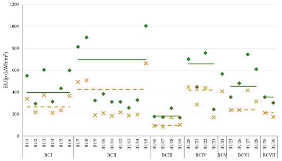 Calculated average total primary energy use intensity for the various building uses (diamond) and for the reference building of each BU (cross). The weighted average for the various building categories is presented with the green solid line and for the reference buildings with the orange dash line.