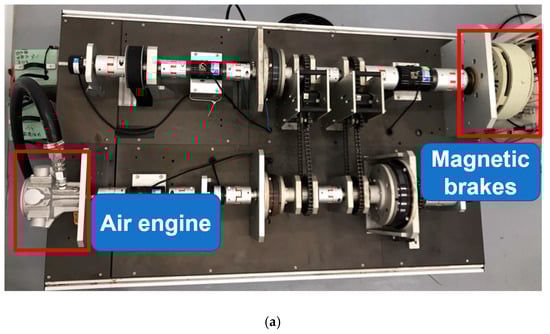 According to Figure 1 and Figure 2, and the three power sources from Figure 5 to Figure 7, the experimental platform was built, as shown in Figure 8. Figure 8a shows the top view of the system with two main shafts, three clutches and two belts links the three power sources, and the out load. Due to the limitation of the platform space, Figure 8b demonstrates that the hub motor and the 125 c.c. SI engine was integrated below the platform.