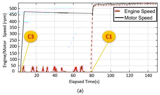 As mentioned in Mode 4 in Table 1, the speed and torque are shown in Figure 10. In Figure 10a, the hub motor starts to accelerate at the third second, and the speed reaches 470 rpm at the 7.2th second. The engine starts to activate from the idle and the C1 is on at the 80.5th second. The hybrid power raises the rotational speed to 510 rpm. Note that because of the engine idle, though the C1 is off in the beginning, the engine speed sensor still measures the temporary engine speed. For the output torque, the hub motor torque rises to 29 N-m at the third second. After C1 is engaged, the motor torque decreases to 11 N-m. Contrarily, the engine torque rises to 17.5 N-m to maintain the gross output torque to the brake.