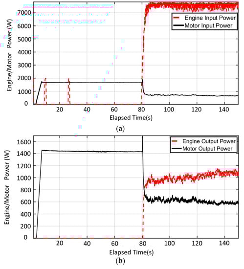 In order to evaluate the efficiency of the hybrid system, the input and output power of dual power sources are calculated based on Figure 1 and Figure 2. The hub motor input electric power rises to 1740W at the 7th second in Figure 11a. As the engine clutch is engaged, the electric input power decreases to 770W at the 80.5th second. Meanwhile, the input power of the engine fuel rises to 7300W. In Figure 11b, the mechanical output power of the hub motor is 1450W. The motor power decreases to 600, as the engine is on and the C1 is engaged. Meanwhile, the output engine power rises to 620W. According to Figure 11a,b, the efficiencies of dual power sources are calculated, as shown in Figure 11c. For the hub motor, the efficiency is 87% at the third second, while 89% at the 80.5th second as the engine clutch is on. For the engine, the efficiency is 13% after the 80th second.
