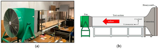 The experiment was conducted in an in-house open-type wind tunnel (shown in Figure 1) located in the basement at the Department of Engineering Science, National Cheng Kung University, Tainan, Taiwan. The test section size of this tunnel is 4.4 m in length, 0.8 m in width, and 0.8 m in height. The wind-making facility includes an SFBM-36D fan made by the Shuenn Farn Ventilator Industrial Co. and a VFD-S frequency converter from Delta. The fan is placed downstream of the tunnel to suck the airflow passing through the test section. The VFD-S frequency converter is used to control the fan rotation speed with a prescribed frequency of 10–60 Hz, so that the incoming flow velocity inside the test section can be adjusted from 1 to 10 m s−1.